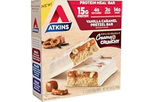 #1:Atkins Vanilla Caramel Pretzel Protein Meal Bar, High Fiber, 2g Sugar, 4g Net Carbs, Meal Replacement, Keto Friendly, 5 Count